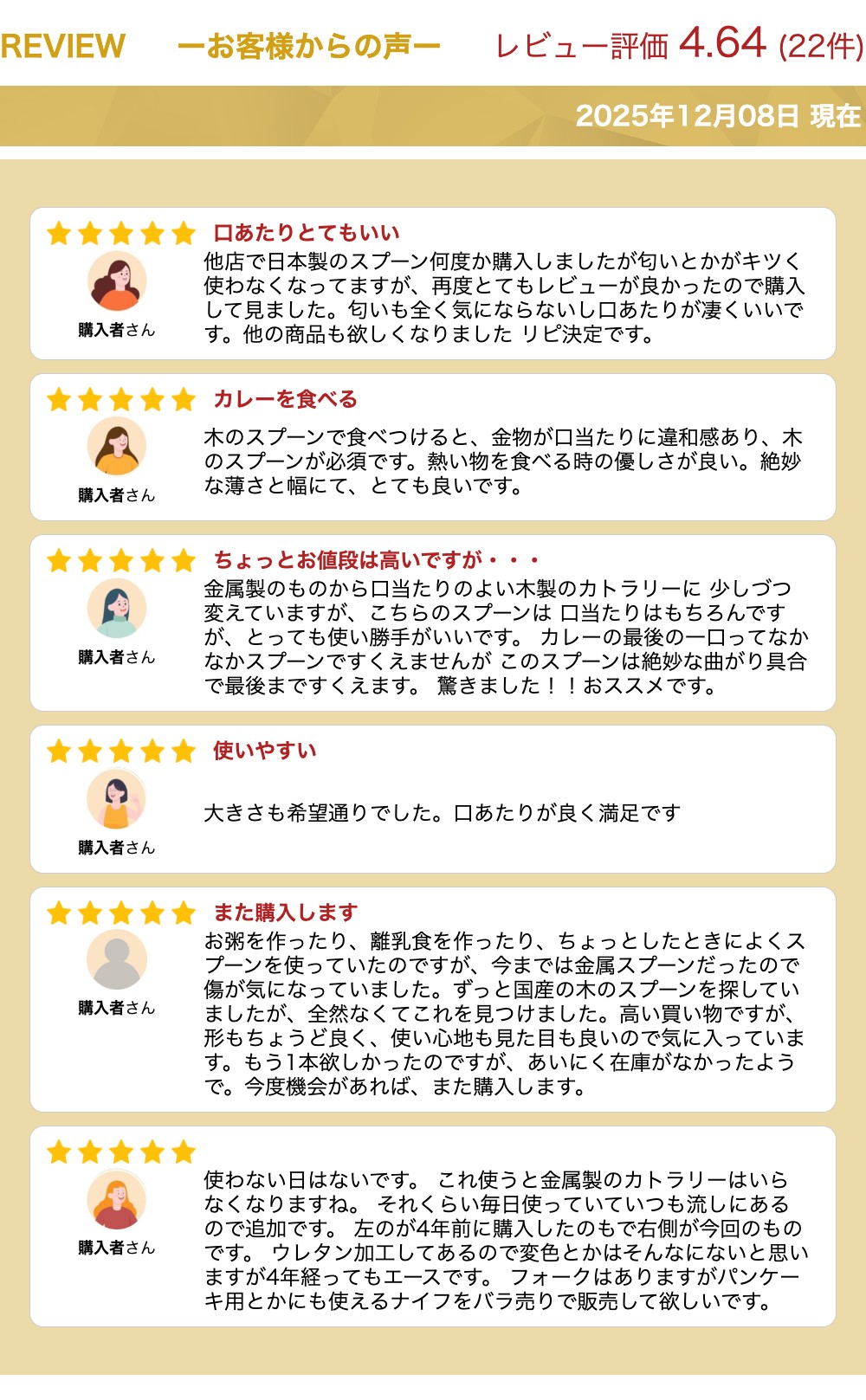 木のスプーンがみんな大好きで。でも口当たりの良いものに出会えずにいたんだけど、これは良さそう!いいお値段だけど長く使うんだから国産の良いものを使いたい!購入決定!