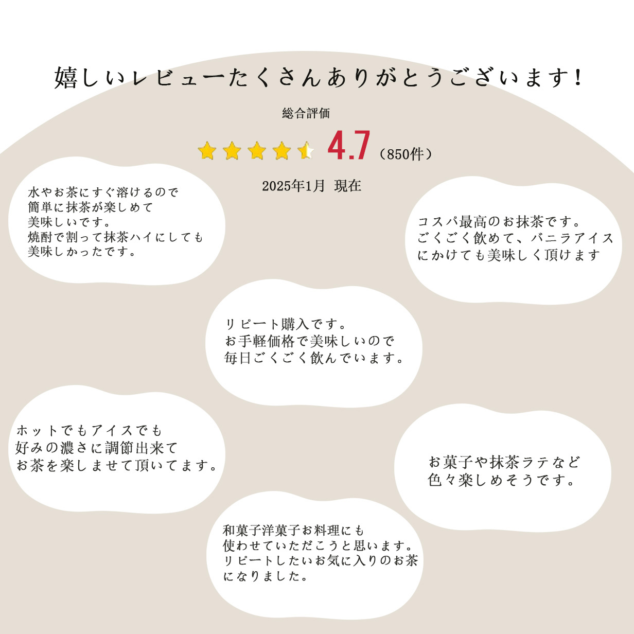 お仕事でお試しさせていただいた抹茶!苦みが少ないからゴクゴク飲めてとても美味しいです。ステンレスボトルにこの抹茶とお湯を入れて出かければいつでも温かいお茶が楽しめるし!料理やお菓子作りにも使えて便利ですよー^^