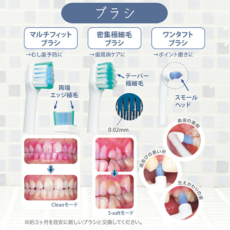 購入して使ってみたけど、かなり良い!(特にワンタフトブラシ)ムスメの分も追加購入。歯科専売品の電動歯ブラシ。3種類のブラシが付いてるのがいい!
