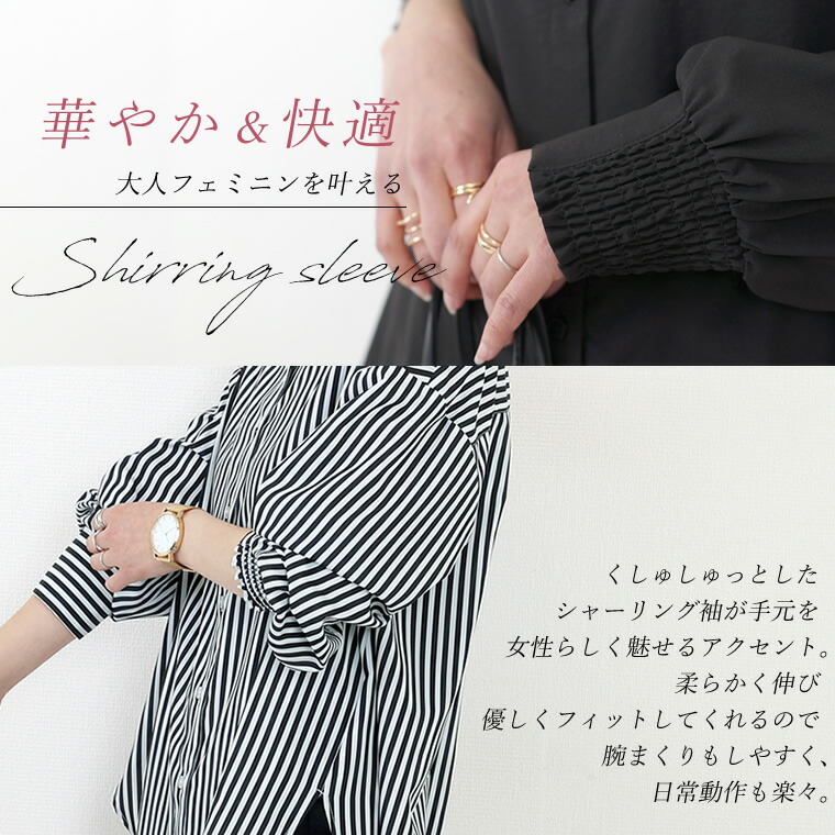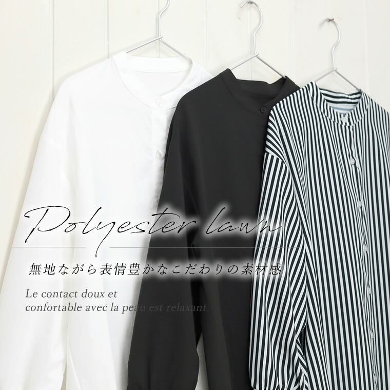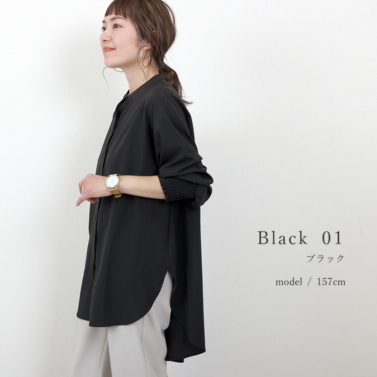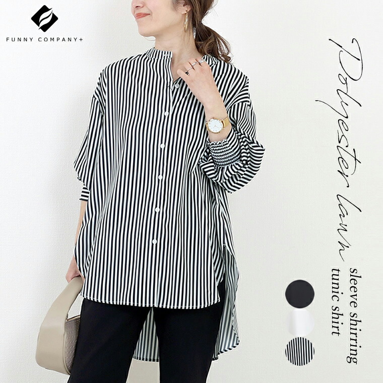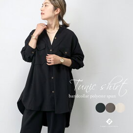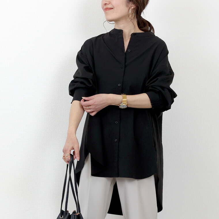 エステルローン袖シャーリングチュニックシャツ 【メール便可/ma1.5】シャツ チュニック ブラウス バンドカラー スキッパー シャーリング きれいめ マット 艶 大人 ローン 春 秋 30代 40代 レディース