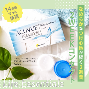 【ジョンソン|アキュビュー オアシス 2week】 近視だけでなく、 ドライアイや飛蚊症なども抱えている目です。 眼科で処方してもらって以来、 数十年このコンタクトを使い続けています。 別メーカーを試したこともありますが、 うるおいの持続感は、やっぱりアキュビューが一番だと感じます。 2週間交換なので、 衛生的に使えるところも安心です。 それから、自分は眼球が小さいので、 ベースカーブ8.4mmがあるのも、とても有難いです🙏
