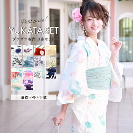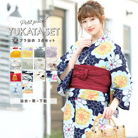 浴衣 3点セット(浴衣/帯/下駄) 赤 エンジ レッド ピンク 菊 桜 縞 椿 朝顔 金魚 水玉 梅 市松 紫陽花 向日葵 レトロ